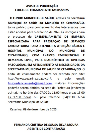 A Prefeitura de Cezarina, por meio do Fundo Municipal de Saúde e da Secretaria Municipal de Saúde, informa que estão abertas as inscrições para o Credenciamento de Empresa Especializada em Serviços Laboratoriais, destinada ao atendimento da Atenção Básica e do Hospital Municipal no exercício de 2026.