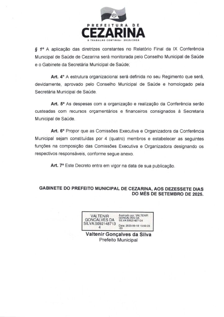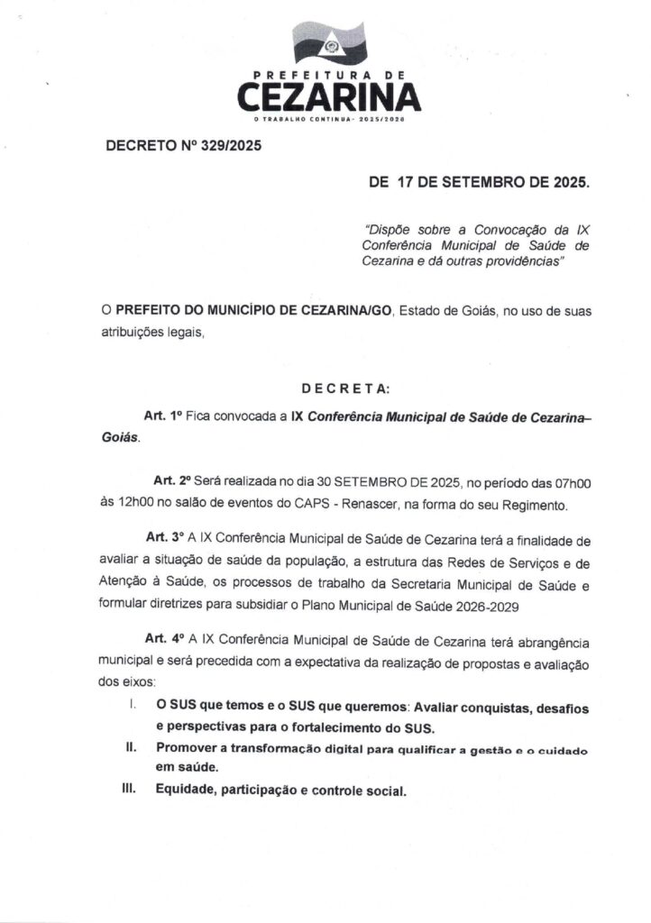 A Prefeitura de Cezarina, por meio do Decreto nº 329/2025, publicado em 17 de setembro de 2025, convoca a IX Conferência Municipal de Saúde de Cezarina, que será realizada no dia 30 de setembro de 2025, das 7h às 12h, no salão de eventos do CAPS – Renascer.