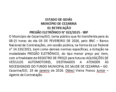 O município de cezarina, por meio da prefeitura municipal, torna público que realizará o pregão eletrônico nº 022/2025 – srp, com a finalidade de realizar o registro de preços para futura aquisição de veículos automotores destinados ao fundo municipal de saúde de cezarina – go.