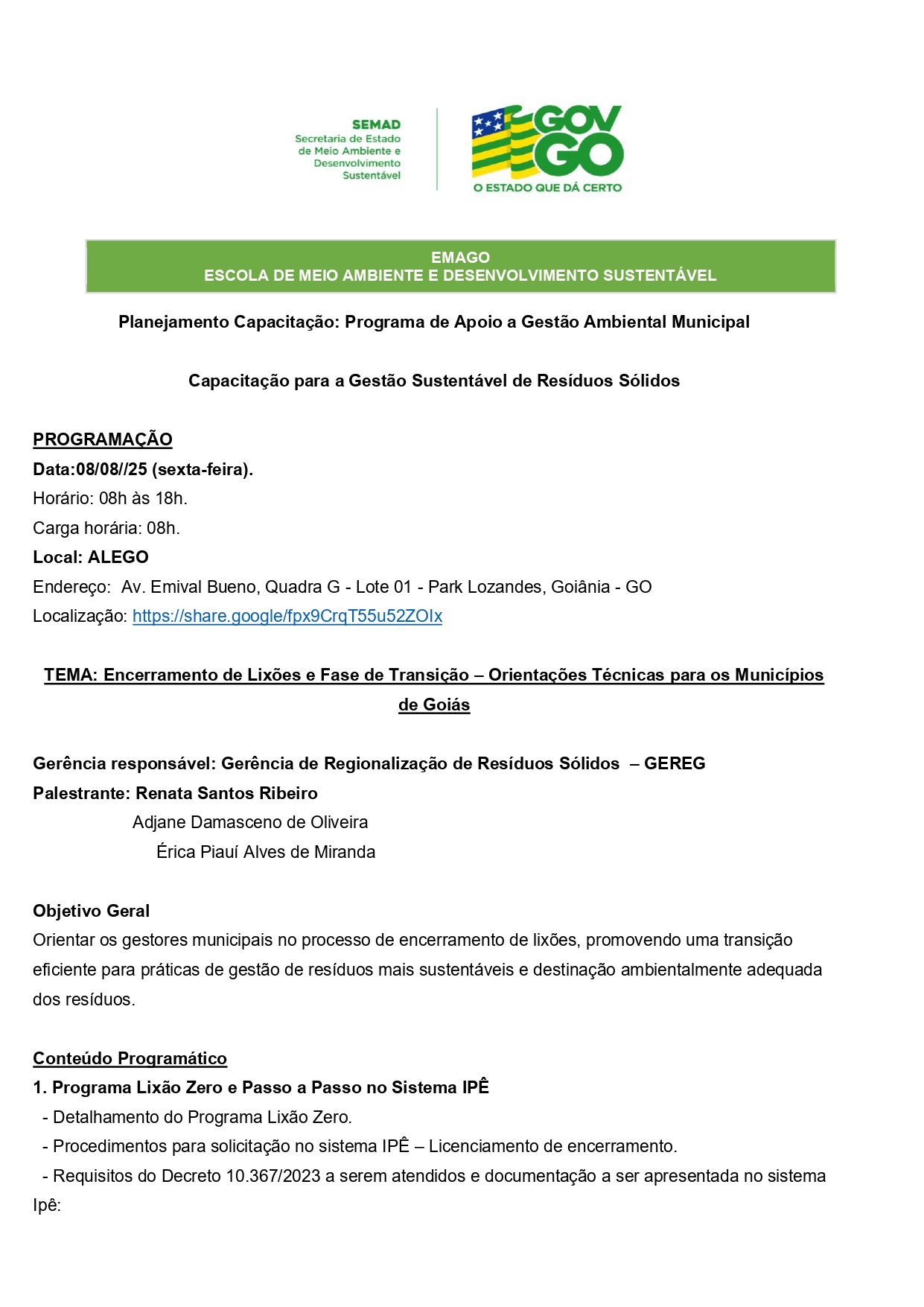 A Secretaria de Meio Ambiente e Desenvolvimento Sustentável promove, por meio da EMAGO, uma capacitação voltada aos gestores municipais sobre práticas sustentáveis de gestão de resíduos sólidos. A programação aborda temas como encerramento de lixões, coleta seletiva, logística reversa e economia circular, com palestras técnicas e orientações práticas para os municípios. O evento será realizado no dia 08 de agosto de 2025, em Goiânia.