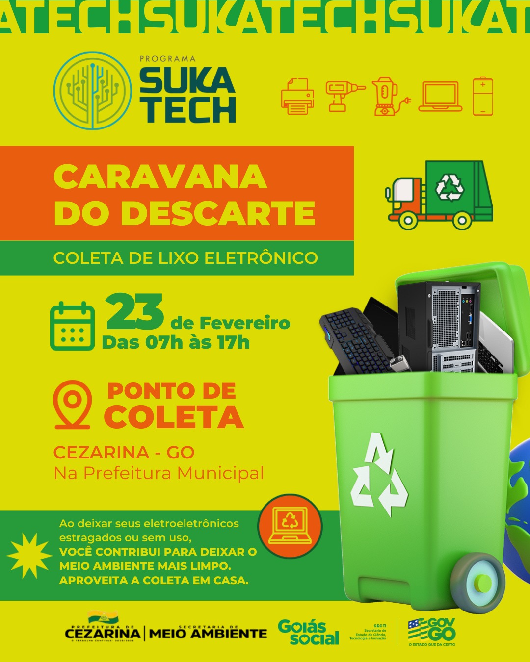 A prefeitura de cezarina, em parceria com o programa suka tech, realizará no próximo dia 23 de fevereiro a caravana do descarte, uma importante ação de coleta de lixo eletrônico no município.
