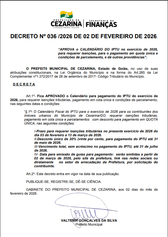 A prefeitura de cezarina aprovou, por meio do decreto nº 036/2026, o calendário fiscal do iptu referente ao exercício de 2026. o documento estabelece os prazos para requerimento de isenções tributárias, pagamento em cota única e condições de parcelamento do imposto DECRETO CALENDÁRIO IPTU 2026.