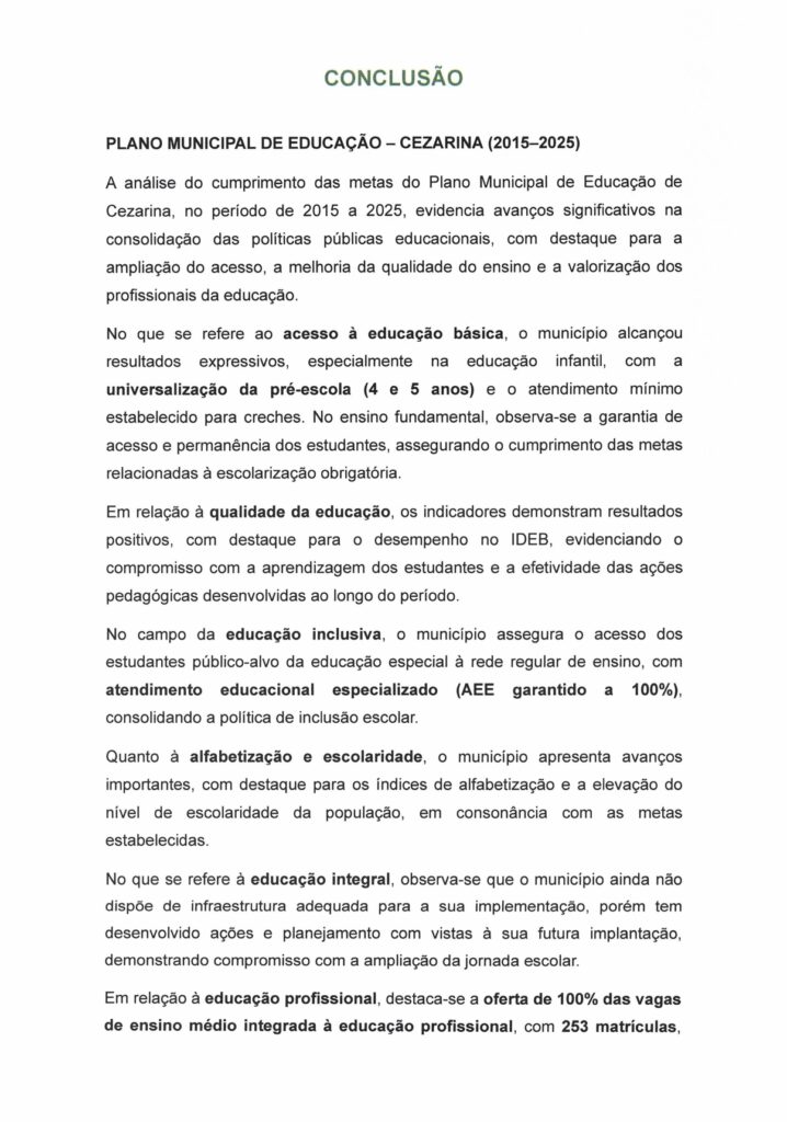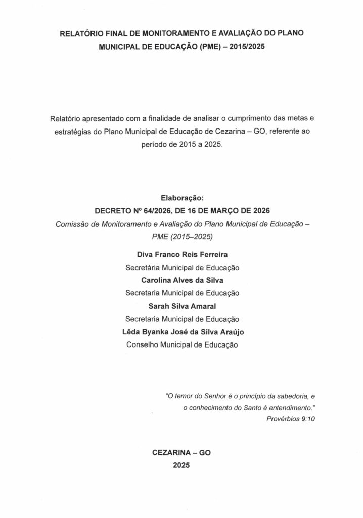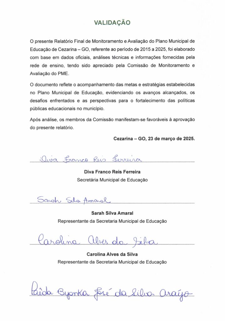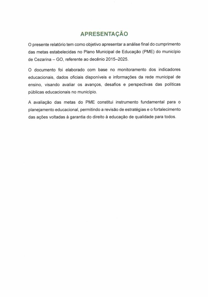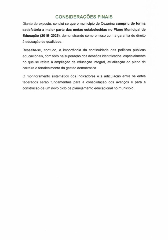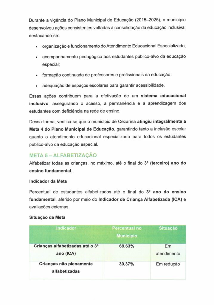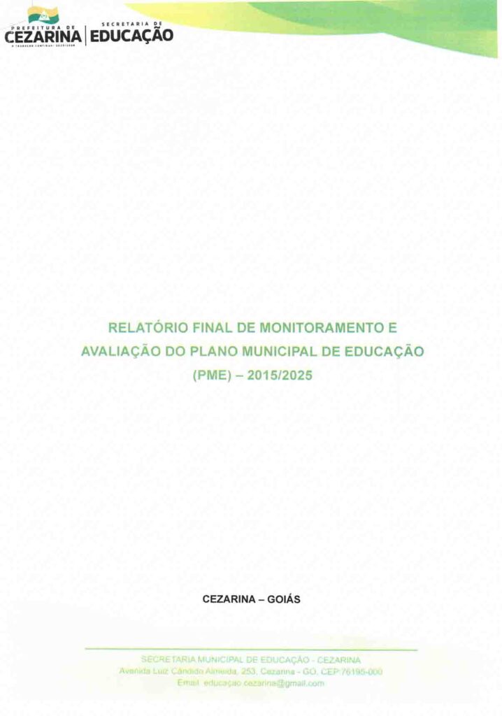 A Prefeitura de Cezarina, por meio da Secretaria Municipal de Educação, apresenta o Relatório Final de Monitoramento do Plano Municipal de Educação (PME) 2015-2025. O documento revela que nossa cidade atingiu resultados históricos e segue transformando o futuro das nossas crianças e jovens!.
