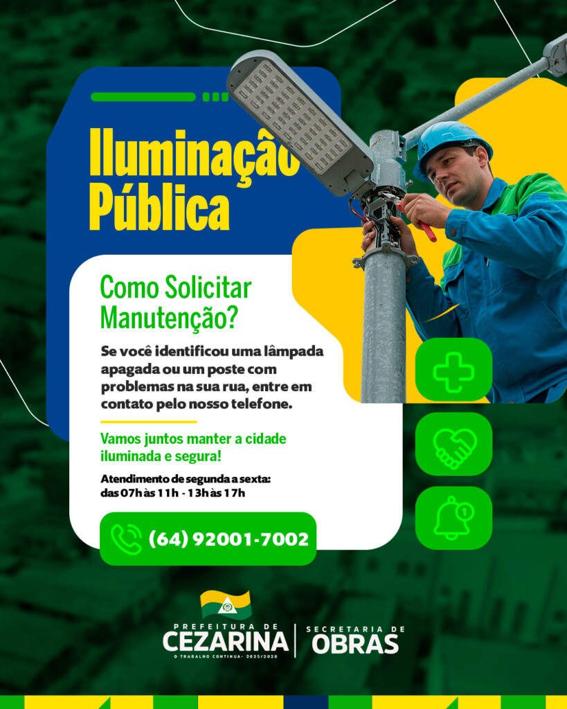 A Prefeitura de Cezarina, por meio da Secretaria de Obras, reforça à população o canal de atendimento para solicitação de manutenção na iluminação pública. O serviço visa garantir mais segurança e bem-estar aos moradores, mantendo as vias e espaços públicos sempre bem iluminados.