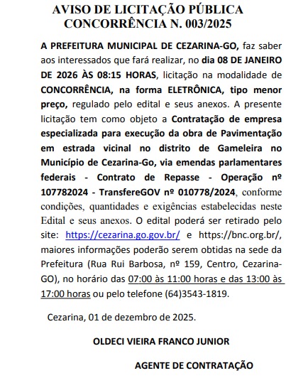 O objetivo da licitação é a contratação de empresa especializada para execução da obra de pavimentação em estrada vicinal no distrito de Gameleira, no município de Cezarina-GO. A obra será realizada por meio de emendas parlamentares federais, conforme o Contrato de Repasse – Operação nº 107782024 (TransfereGOV nº 010778/2024).