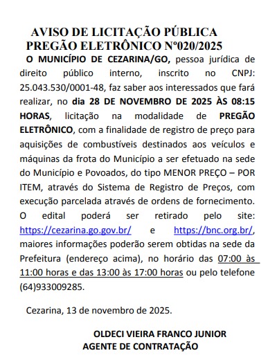 A Prefeitura Municipal de Cezarina informa que realizará, no dia 28 de novembro de 2025, às 08h15, o Pregão Eletrônico nº 020/2025, com a finalidade de registro de preços para aquisição de combustíveis destinados aos veículos e máquinas que compõem a frota do Município e de seus Povoados.
