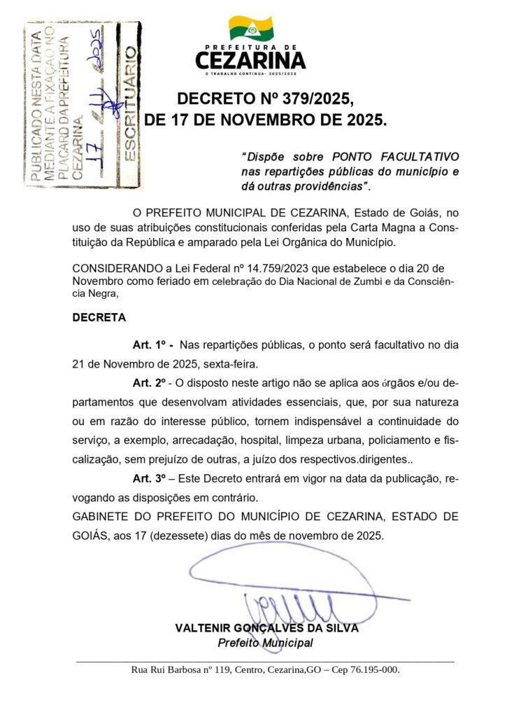 A Prefeitura Municipal de Cezarina publica, nesta segunda-feira (17/11), o Decreto nº 379/2025, que estabelece ponto facultativo nas repartições públicas municipais na sexta-feira, dia 21 de novembro de 2025.
