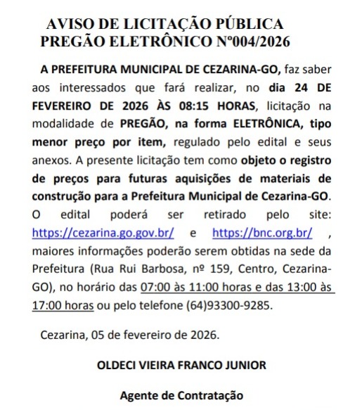 A Prefeitura Municipal de Cezarina-GO informa que realizará Licitação Pública, na modalidade Pregão Eletrônico nº 004/2026, do tipo menor preço por item, destinada ao registro de preços para futuras aquisições de materiais de construção que atenderão às necessidades da Administração Municipal.