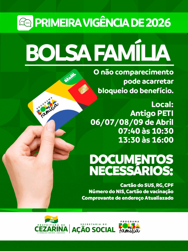 A Prefeitura de Cezarina, por meio da Secretaria de Ação Social, inicia nesta semana a Primeira Vigência de 2026 do Programa Bolsa Família. O acompanhamento é uma etapa essencial do programa e tem como objetivo garantir que as famílias beneficiárias estejam cumprindo as condicionalidades de saúde e assistência social.
