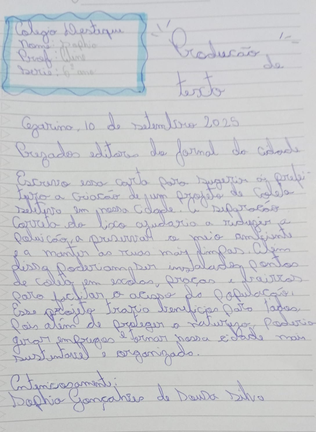 A Prefeitura de Cezarina tem orgulho em compartilhar a iniciativa da estudante Sophia, aluna do 6º ano do Ensino Fundamental, que escreveu uma carta sugerindo a criação de um projeto de coleta seletiva em nossa cidade.